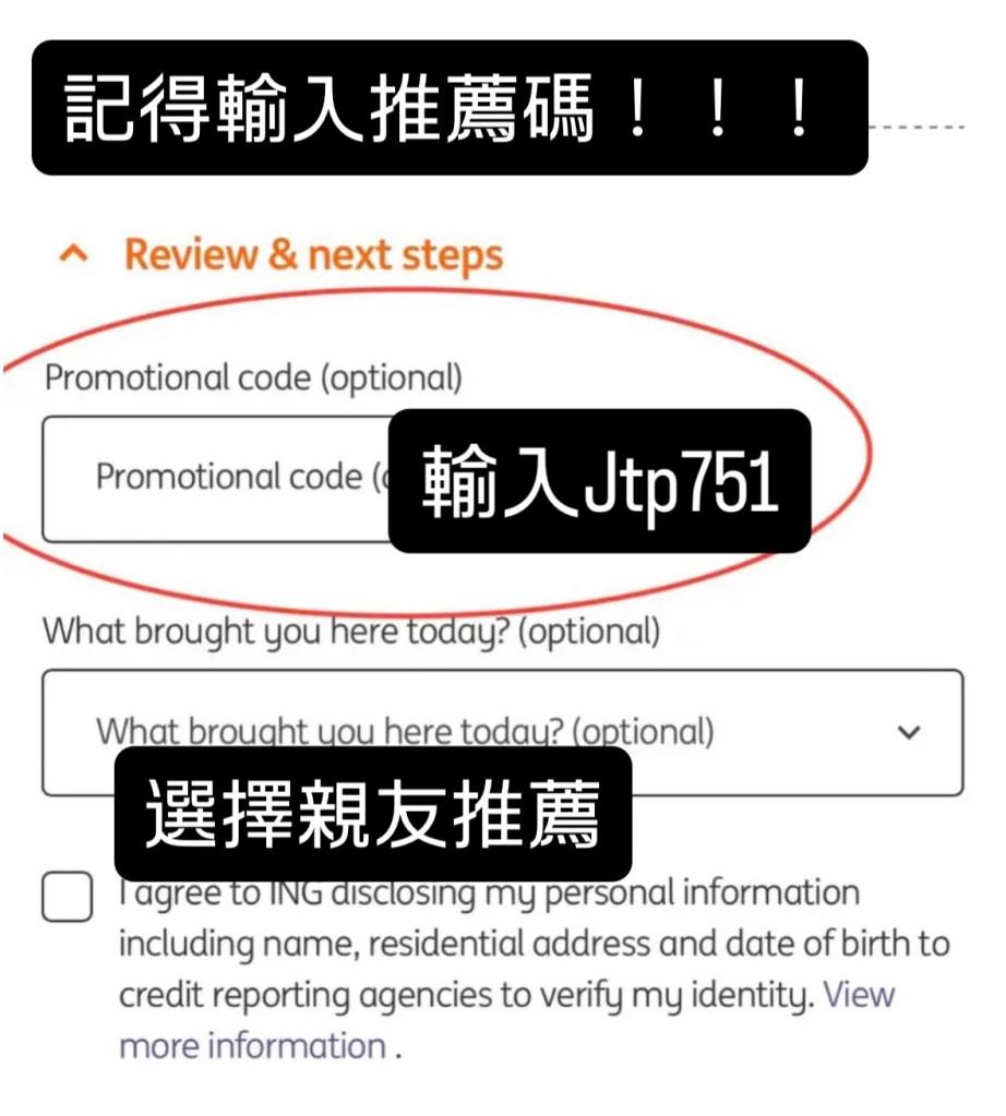 在澳洲多虧有ING銀行,讓我每個月都拿到兩百多澳幣的利息,這篇文章將手把手教你如何開戶,只要使用我的推薦碼Jtp751申辦即可獲得100塊澳幣獎勵,以下是申辦教學: