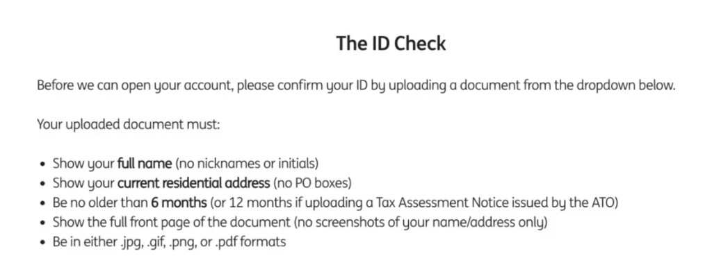 ID check,可以選擇澳洲駕照或海外護照輸入護照作為證明,如果有澳洲駕照的話會比較簡單,不需要再到郵局驗證身份