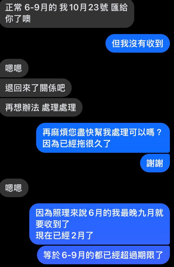 沒想到,他居然說這錢我確實有匯,你們沒收到是你們的問題,我這邊也沒收到銀行的退款,不知道那筆錢去哪了,那筆錢就是不見了😡超級荒謬,正常銀行沒辦法入帳本來就會退款到原本帳戶,他居然還賴皮,我不放棄的發揮名偵探柯南精神,抽絲剝繭、堅持不懈,後來發現他根本把我退休金帳號打錯,再加上我第二份工作的退休金也都入帳了,態度很強硬跟他說他才補匯款給我,而且他甚至還說反正我回台灣退休金也是只能拿35%,還是他直接給我35%的現金,超級瞎🙄