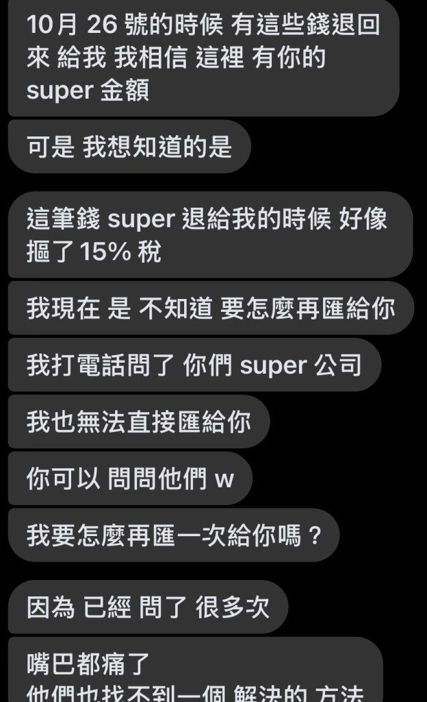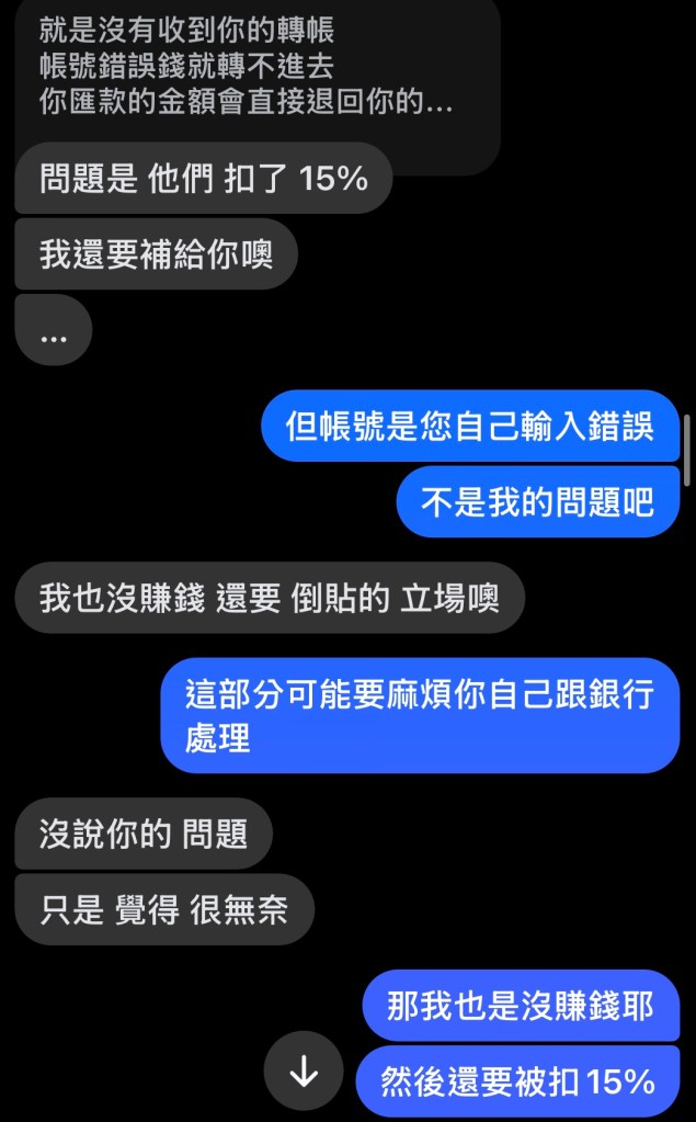 最後終於要還我錢了,又說他是有收到退款但退款不知道為什麼被扣15%,要從我的錢裡扣🤷明明是他自己打錯帳號,關我什麼事,我跟他說帳號是您自己打輸入錯誤,不是我的問題吧,他還回我,我沒賺錢,還要倒貼喔🙄