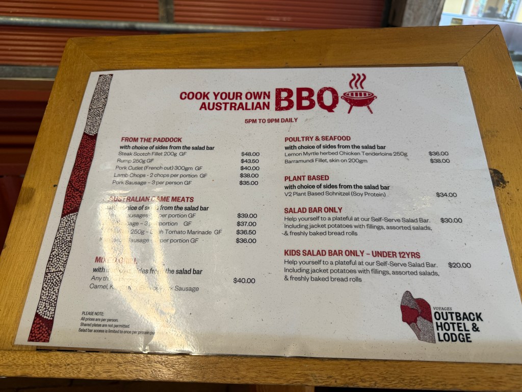 午餐和晚餐的部分有自助BBQ和快餐吧可以選擇,BBQ的話是可以自己選肉然後要自己烤,然後還有沙拉自助吧,價格是26-28澳幣依照肉類價格不同,也可以選擇只吃沙拉吧是24澳幣,我的室友有吃牛排BBQ她說不好吃😂